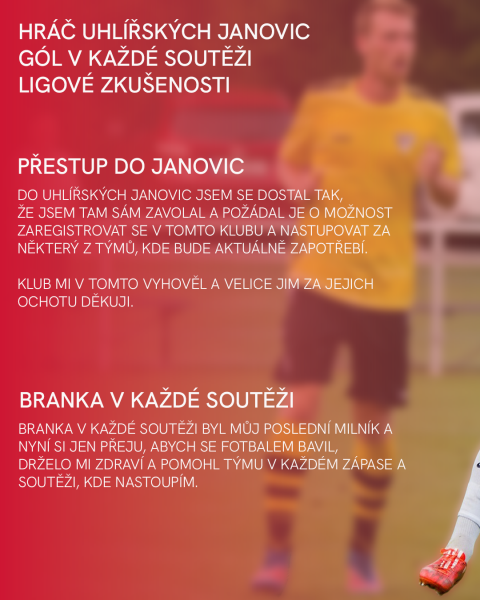 🎙Do Uhlířských Janovic jsem se dostal tak, že jsem tam sám zavolal a požádal je o možnost zaregistrovat se v tomto klubu a nastupovat za některý z týmů, kde bude aktuálně zapotřebí. Klub mi v tomto vyhověl a velice jim za jejich ochotu děkuji.