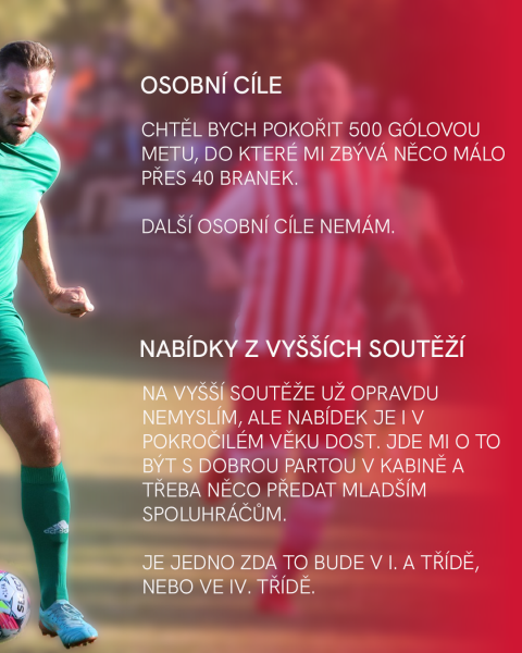 Na vyšší soutěže už opravdu nemyslím, ale nabídek je i v pokročilém věku dost. Jde mi o to být s dobrou partou v kabině a třeba něco předat mladším spoluhráčům. Je jedno zda to bude v I. A třídě, nebo ve IV. třídě.